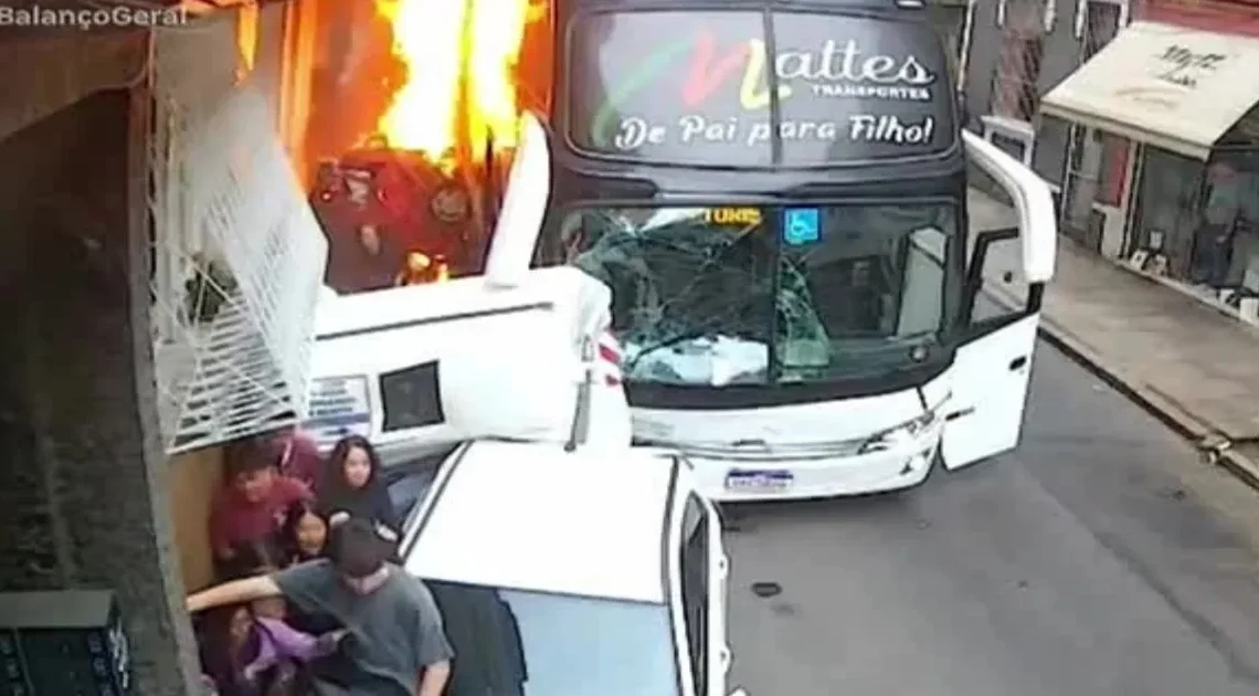 Um momento de pânico e correria tomou conta do Centro Histórico de Porto Alegre na tarde de sexta-feira (3), quando um ônibus de turismo com 55 estudantes de Vacaria pegou fogo após colidir com fios de energia e dez veículos estacionados. As cenas, registradas em vídeo, mostram os jovens gritando e tentando escapar pelas janelas, enquanto o fogo se espalhava rapidamente pela parte traseira do veículo.